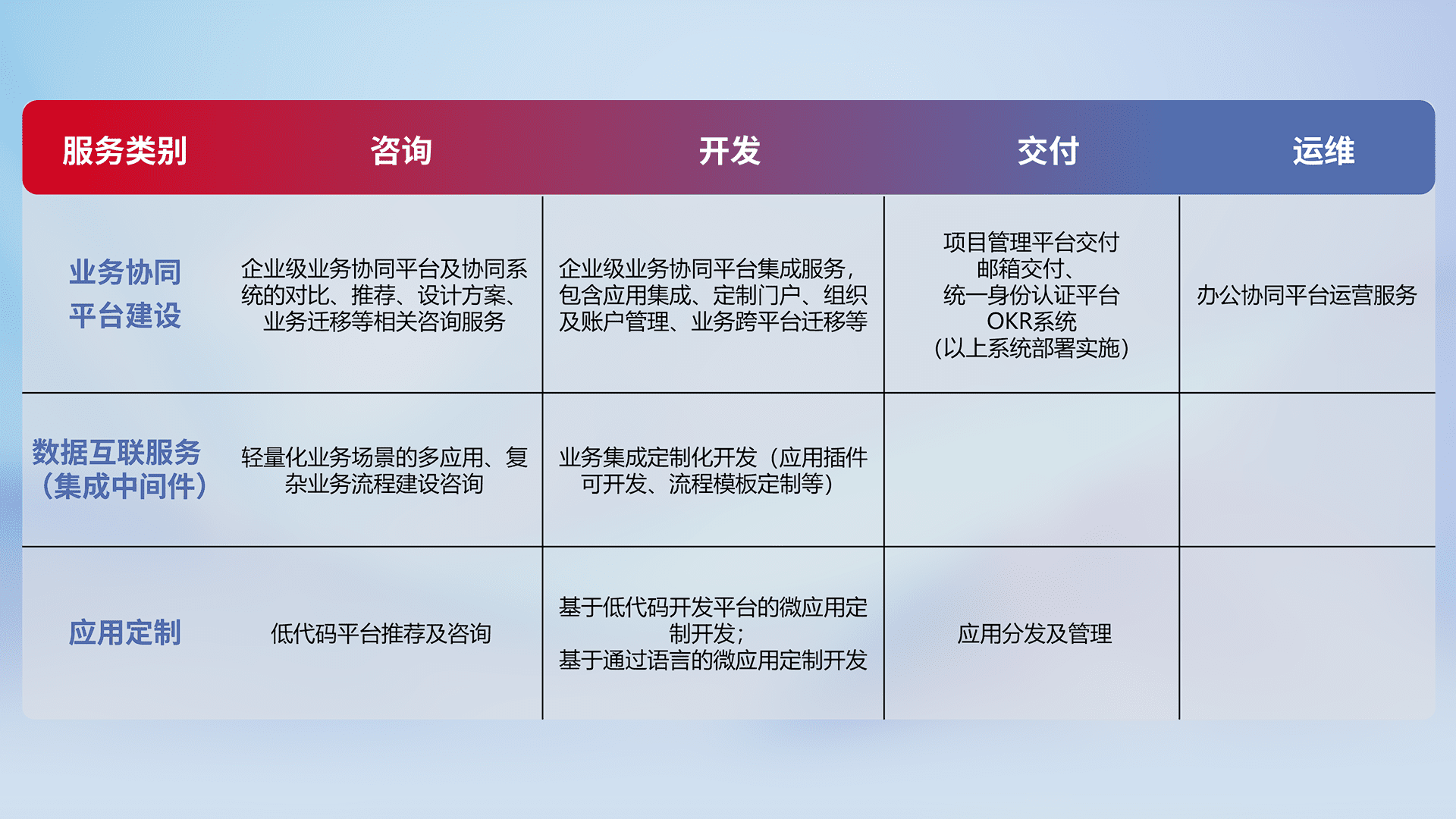 针对钉钉、、企微、、IDaas等平台级产品提供产品的规划、、、方案、、、、交付、、、定制化开发等服务,,,实现如统一协同办公、、、、智能客户服务、、混合会议管理、、、、智能数据查询、、、、等业务场景,,,实现数字化转型。。。